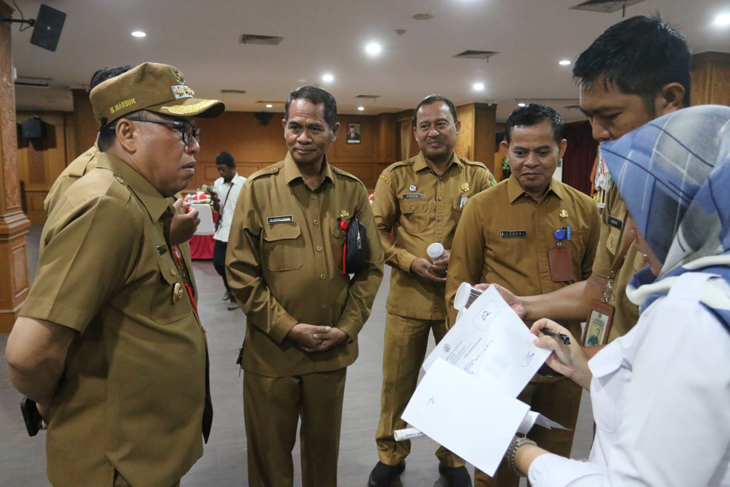 Penjabat (Pj) Bupati PPU, Makmur Marbun saat meninjau tes urine yang diikuti ratusan ASN dan THL di Setkab PPU, Senin (16/10/2023). TITIKNOL.ID/HO