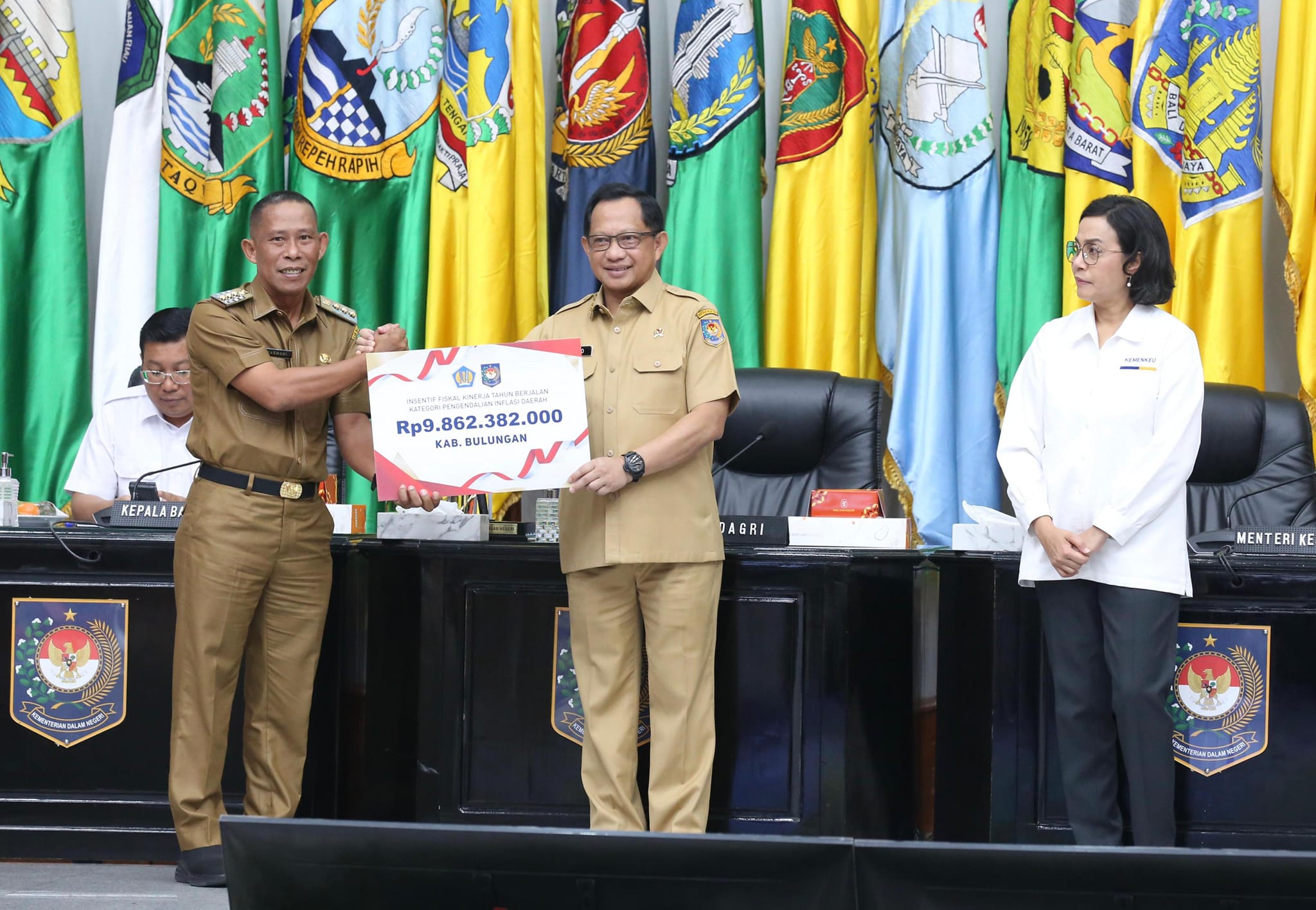 Bupati Bulungan Syarwani (kiri) menerima secara simbolis insentif keuangan atas kinerja pengendalian inflasi terbaik periode ketiga 2023 dari Menteri Dalam Negeri Tito Karnavian disaksikan oleh Menteri Keuangan Sri Mulyani di Jakarta, Selasa (6/11/2023). HO/DOKPIM BULUNGAN