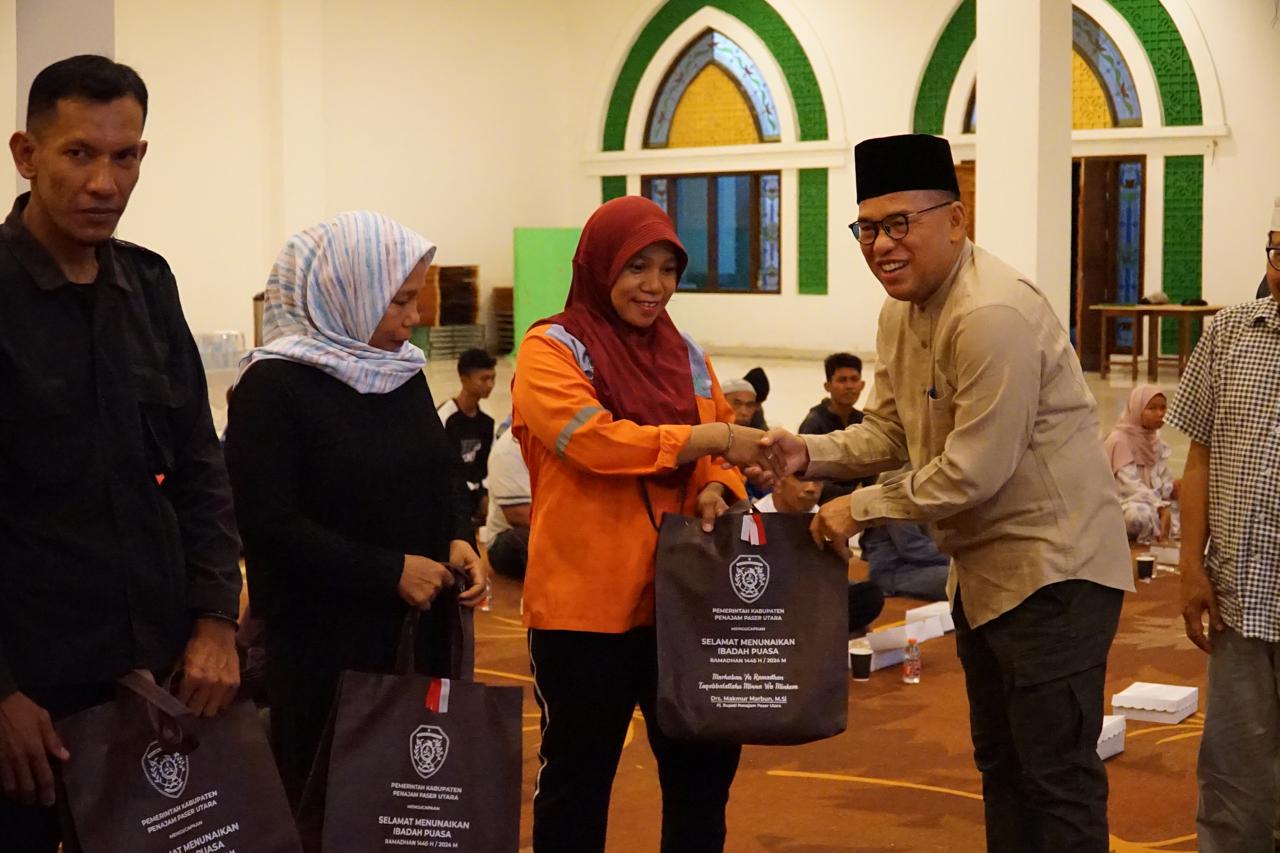 BINGKISAN – Penjabat Bupati Penajam Paser Utara (PPU) Makmur Marbun memberikan bingkisan saat menggelar sahur bareng di aula Masjid Agung Penajam, Jumat (15/3/2024). TITIKNOL.ID/HO