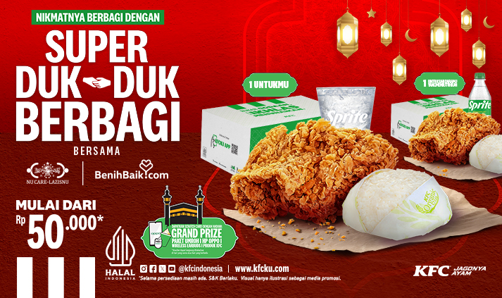PAKET – Di bulan Ramadhan ini KFC juga memberikan kesempatan kepada customer untuk berbagi.Seperti super Duk-Duk Berbagi terdiri dari 2 paket yaitu 1 paket untuk customer yang membeli dan 1 paket akan diserahkan store ke saudara yang membutuhkan. TITIKNOL.ID/HO