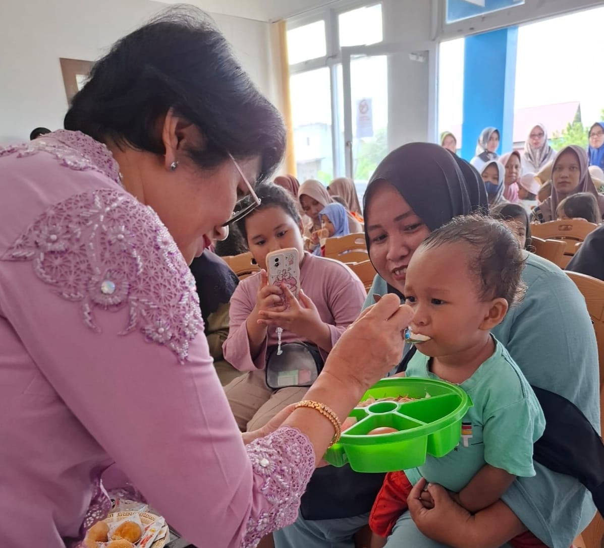 Ketua TP PKK Kabupaten PPU, Linda Romauli Siregar saat menyuapi seorang balita dalam kunjungan intervensi penurunan stunting. TITIKNOL.ID/HO/HUMAS06