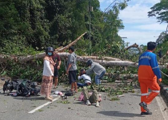Menurut saksi mata, Darmiati, pohon tumbang terjadi secara tiba-tiba saat pengendara melintas di lokasi kejadian.